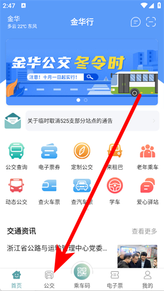 1、打開(kāi)金華行,點(diǎn)擊底部公交按鈕,進(jìn)入實(shí)時(shí)公交查詢(xún)界面。