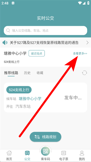 2、在實(shí)時(shí)公交頁(yè)面,點(diǎn)擊查看更多,瀏覽更多公交線路信息。