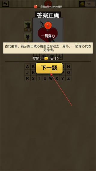 4、猜中成語后,點(diǎn)擊下一題可繼續(xù)挑戰(zhàn)后續(xù)關(guān)卡。