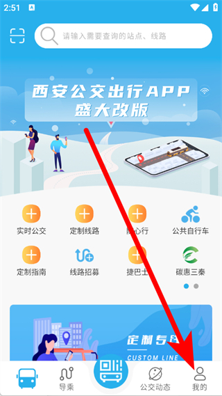 1、打開(kāi)西安公交出行,在首頁(yè)點(diǎn)擊底部我的。