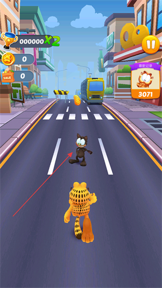 1、游戲開局動畫一只黑貓搶奪了加菲貓的食物,我們需要操控加菲貓進行跑酷追逐。