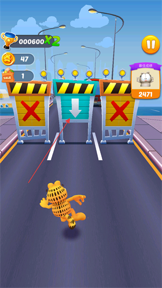 4、遇到這種指示標牌時,我們可以移動到中間道路下劃屏幕讓加菲貓滑鏟通過。