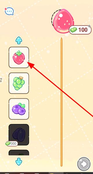 2、使用左邊水果素材串起來(lái),選取草莓、葡萄等水果,將其串在竹簽上,為制作糖葫蘆做準(zhǔn)備。