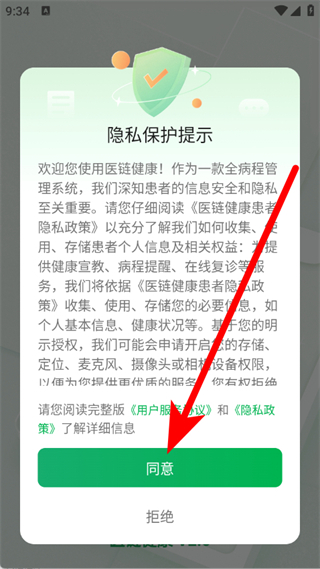 1、打開醫(yī)鏈健康,在隱私保護(hù)提示彈窗中點擊同意。