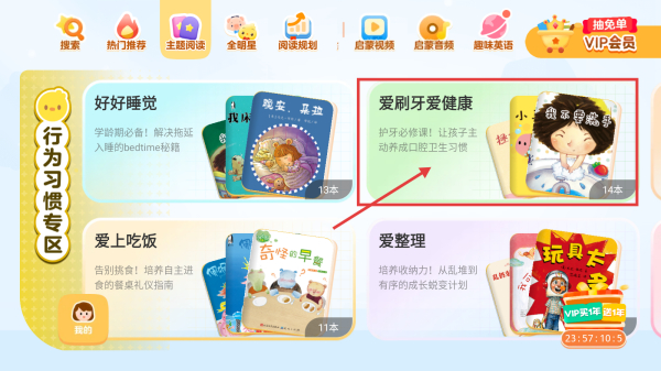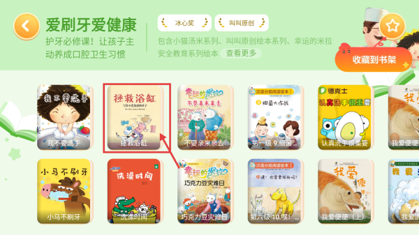 2、在主題閱讀頁面,點擊愛刷牙愛健康板塊,進入該主題的繪本列表頁面。