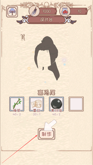 2、在設(shè)計臺選擇材料如藤蔓、蕾絲、黑琺瑯,點擊制作,生成服飾部件如高馬尾。