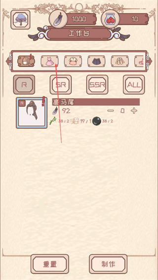 4、在工作臺選擇服飾類型如SR級,搭配制作好的部件如高馬尾,點擊制作,完成服飾制作。