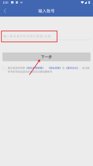 3、在輸入賬號頁面,輸入賬號或手機號,點擊下一步,進入注冊頁面。