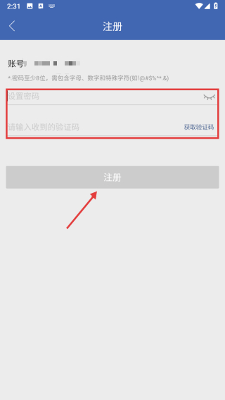 4、在注冊頁面,設置密碼并輸入收到的驗證碼,點擊注冊按鈕,完成賬號注冊操作。
