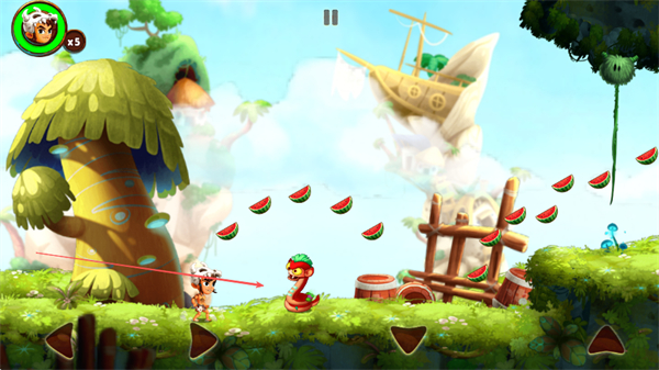2、在場景中收集水果如芒果、香蕉、西瓜,香蕉組成的圓環(huán)收集后可觸發(fā)特殊效果,幫助角色獲得更多資源或能力。