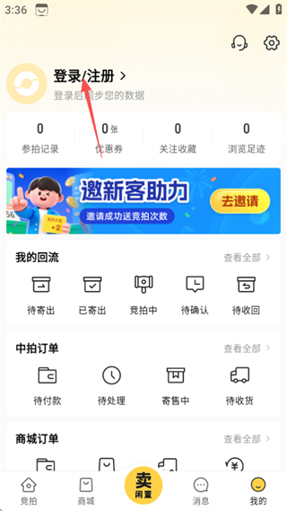 2、在個(gè)人頁(yè)面,點(diǎn)擊登錄注冊(cè)區(qū)域,進(jìn)入登錄注冊(cè)選擇頁(yè)面。