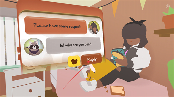 1、點擊Reply按鈕發(fā)送信息與小浣熊對話聊天,觸發(fā)劇情進入游戲內(nèi)容。