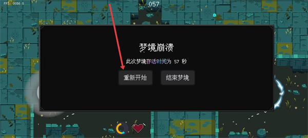 4、最下方血量耗盡夢境崩潰,可選擇重新開始繼續(xù)游戲,挑戰(zhàn)更長的時間。