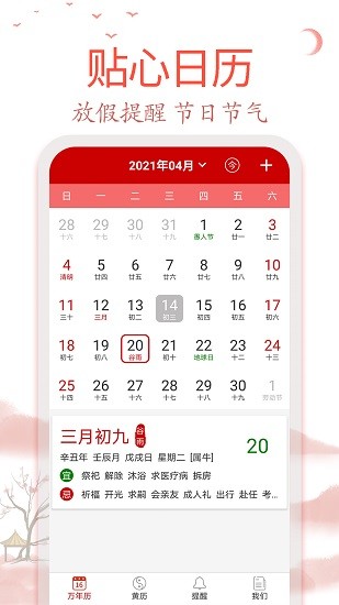 還有黃歷命理資訊,節(jié)氣養(yǎng)生,節(jié)日倒數(shù),生辰八字,生日管家,星座分析,歷史今天,記事提醒等功能。萬(wàn)年歷黃歷日歷,專注時(shí)間管理,高效生活,我們只想做您身邊的好幫手!