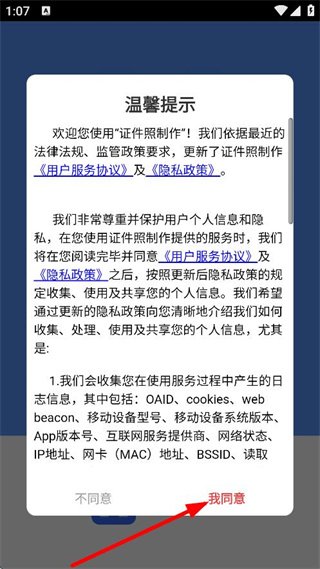 1、在溫馨提示彈窗中,點擊我同意,進入證件美拍頁面。