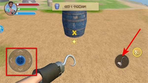 2、在島嶼場(chǎng)景中,通過左側(cè)搖桿移動(dòng),點(diǎn)擊右側(cè)鉤子按鈕,擊碎木桶等物品。