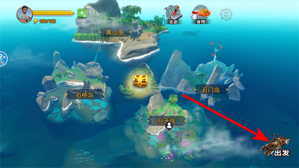 1、在游戲地圖頁面,點(diǎn)擊右下角出發(fā)按鈕,前往目標(biāo)島嶼。