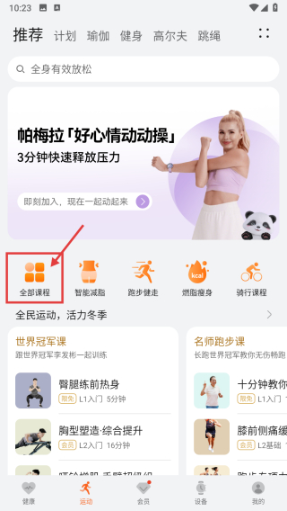 2、在運動頁面,點擊全部課程分類標(biāo)簽,進入全部健身課程頁面。