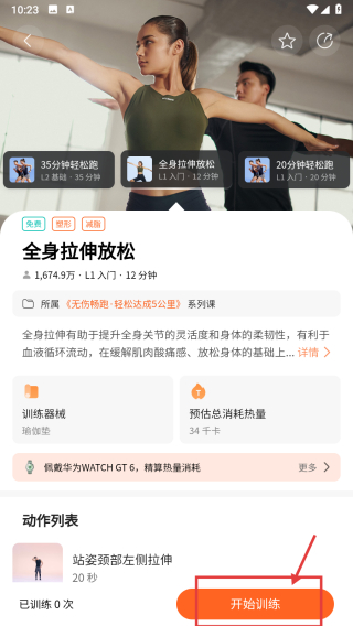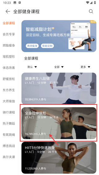 3、在全部健身課程頁面,選擇全身拉伸放松課程,進入課程詳情頁面。