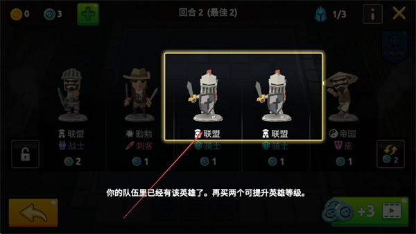 1、在選棋階段,選擇相同的“聯(lián)盟騎士”英雄,購(gòu)買兩個(gè)可提升其等級(jí)。