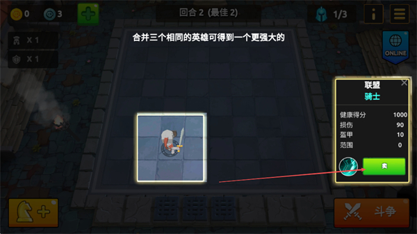 2、將三個(gè)相同的英雄合并,可得到更強(qiáng)大的英雄,點(diǎn)擊綠色按鈕確認(rèn)合并操作。