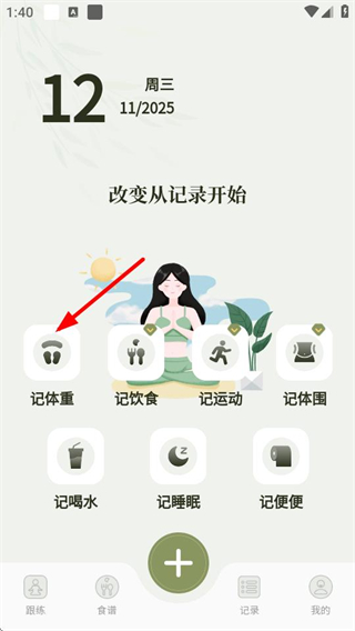 2、在記錄頁(yè)面點(diǎn)擊記體重,可進(jìn)入體重記錄環(huán)節(jié)。