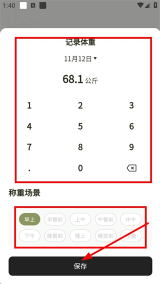 3、在記錄體重頁(yè)面輸入體重?cái)?shù)值并選擇稱重場(chǎng)景,點(diǎn)擊保存完成體重記錄。