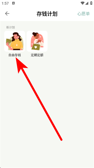 3、在存錢計劃頁面,點擊自由存錢,進(jìn)入添加計劃頁面。