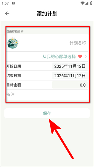 4、填寫計劃名稱、開始日期等信息,點擊保存,完成存錢計劃設(shè)置。