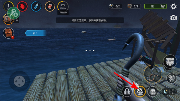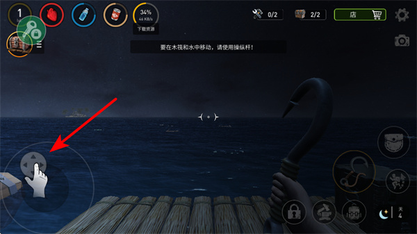 1、游戲中通過左側(cè)虛擬搖桿操控木筏移動,這是在水域中探索、收集資源的基礎(chǔ)操作,確保準(zhǔn)確到達(dá)區(qū)域。
