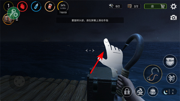 2、滑動屏幕可旋轉(zhuǎn)頭部視角,這是觀察周圍環(huán)境、發(fā)現(xiàn)資源和危險(xiǎn)的關(guān)鍵操作,需全面查看水域遠(yuǎn)處情況。