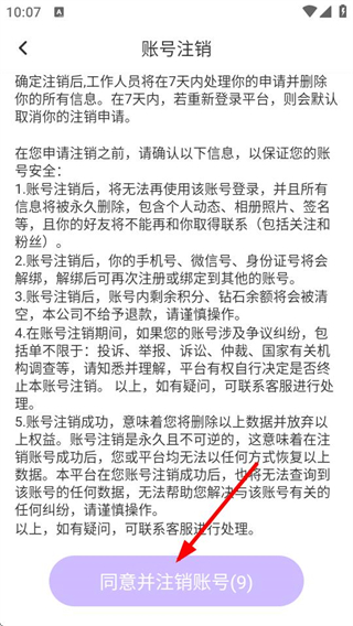 4、在賬號(hào)注銷(xiāo)頁(yè)面點(diǎn)擊同意并注銷(xiāo)賬號(hào),完成賬號(hào)注銷(xiāo)操作。