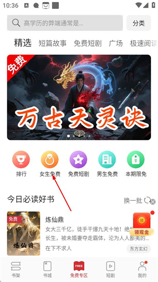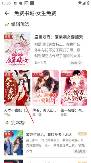 2、在免費專區(qū)頁面,點擊女生免費選項,進(jìn)入免費書城女生免費頁面。