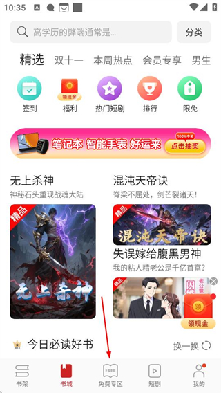 1、在閱讀快看版首頁,點擊底部免費專區(qū)選項,進(jìn)入免費專區(qū)頁面。