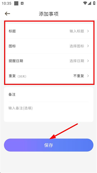 3、在添加事項(xiàng)頁(yè)面填寫事項(xiàng)信息后,點(diǎn)擊保存完成提醒事項(xiàng)添加。