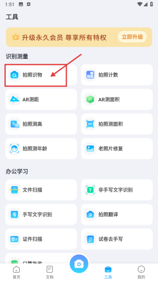 2、在工具功能頁面,點擊拍照識物選項,進入拍照識物界面。