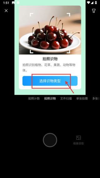 3、在拍照識物界面,點擊選擇識物類型按鈕,進入識別類型選擇頁。
