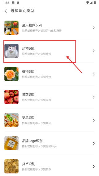 4、在識別類型選擇頁,點擊動物識別選項,開始進行動物識別操作。