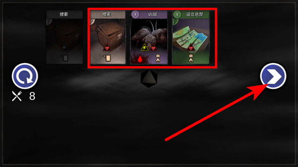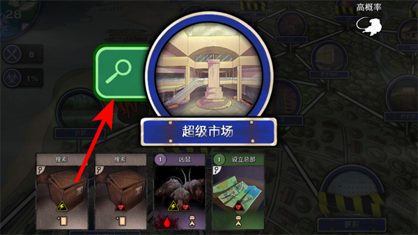 3、進入地點后,點擊搜索圖標,可觸發(fā)搜索事件,出現(xiàn)搜索、兇鼠、設立總部等選項。
