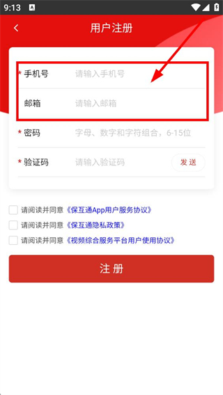 3、在用戶注冊(cè)頁(yè)面,輸入手機(jī)號(hào)、郵箱,來(lái)進(jìn)行下一步。