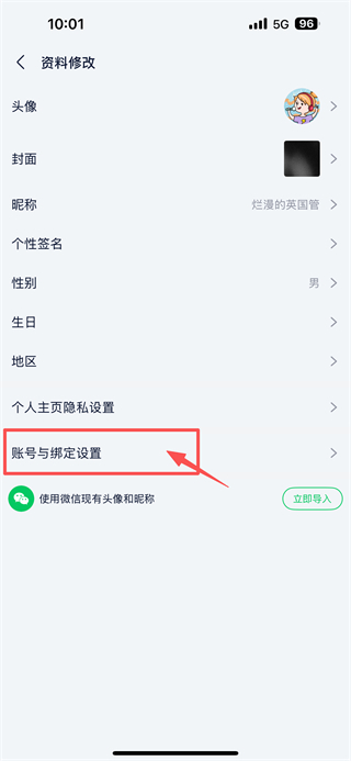 3、在資料修改頁面,點(diǎn)擊賬號與綁定設(shè)置選項(xiàng),進(jìn)入賬號管理頁面。