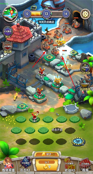2、在戰(zhàn)斗中合理布局塔防建筑,利用不同建筑的攻擊特性,有效消滅敵人,積累金幣資源。