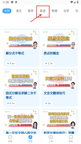 2、在發(fā)現(xiàn)頁面,點擊英語分類,進(jìn)入英語學(xué)習(xí)內(nèi)容列表頁。