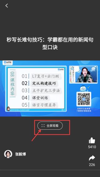 3、在英語學(xué)習(xí)內(nèi)容列表里,選擇秒寫長難句技巧:學(xué)霸都在用的新詞句型口訣條目,進(jìn)入課程播放頁面。
