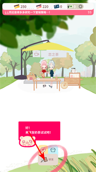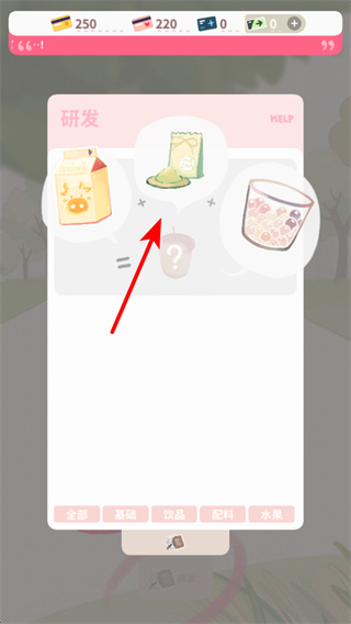 1、游戲中點擊研發(fā)按鈕,可進入奶茶研發(fā)界面,這是制作新奶茶的關鍵操作,點擊后可嘗試搭配食材研發(fā)新品。