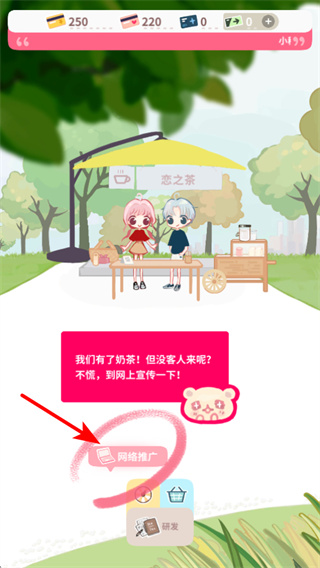 3、點擊網絡推廣選項,可宣傳自家奶茶店,這是吸引顧客的關鍵步驟,推廣時需及時操作以提升店鋪知名度。