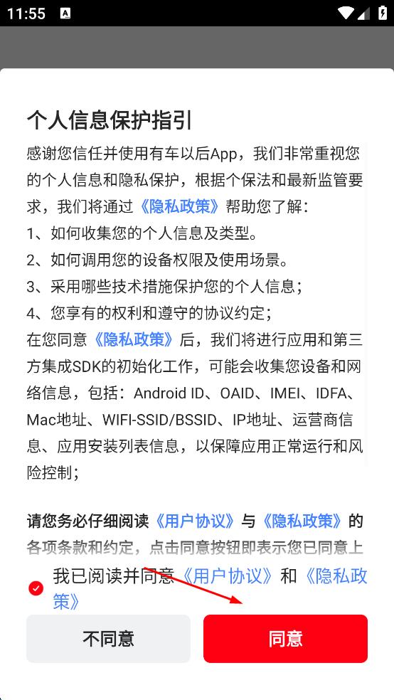 1、打開有車以后APP,在個(gè)人信息保護(hù)指引界面,勾選“我已閱讀并同意《用戶協(xié)議》和《隱私政策》”,點(diǎn)擊同意,進(jìn)入APP主界面。