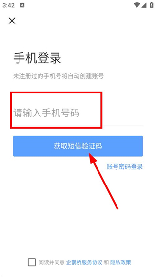 3、在手機(jī)登錄頁面,輸入手機(jī)號(hào)碼,點(diǎn)擊獲取短信驗(yàn)證碼。