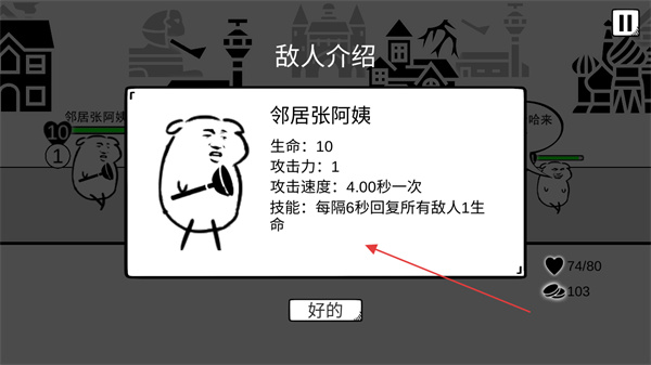 2、查看敵人介紹,如鄰居張阿姨的生命、攻擊力、攻擊速度和技能,做好戰(zhàn)斗準(zhǔn)備。