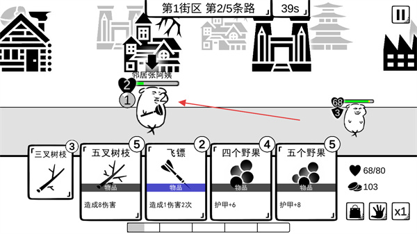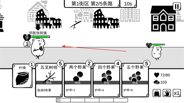 3、在戰(zhàn)斗中,選擇合適的物品卡片,如檸檬造成傷害,野果增加護(hù)甲,應(yīng)對(duì)敵人鄰居張阿姨的攻擊。